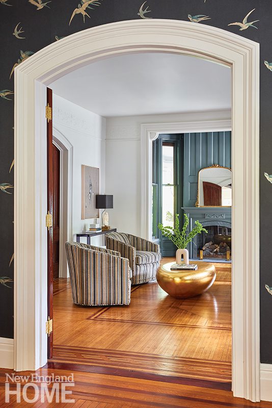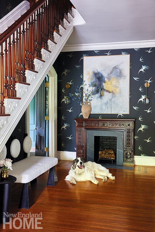 The foyer gives the first hint that this isn’t your great-grandmother’s fusty Victorian. The polished wood floors, white moldings, and ornate banister may say yesteryear, but the striking Sanderson wallpaper depicting a flock of swallows against a midnight-black sky is both contemporary and timeless.