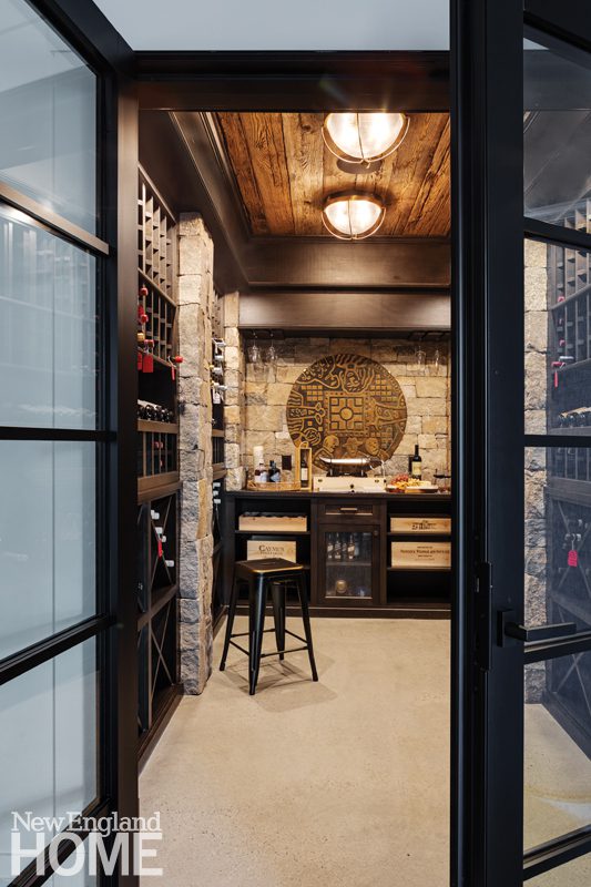 The basement wine room, a favorite space of the owners and builders alike, combines temperature-controlled wine storage with warm elements like a round, metal bas-relief sculpture taken from the former cottage and stonework that matches the exterior foundation—design symmetry that makes sense when you exit the basement via the stone-grotto walkout to the backyard pool. “This was a flawless canvas to work on, and it was fun to marry all these different elements to create a unique vision,” says Tenney.