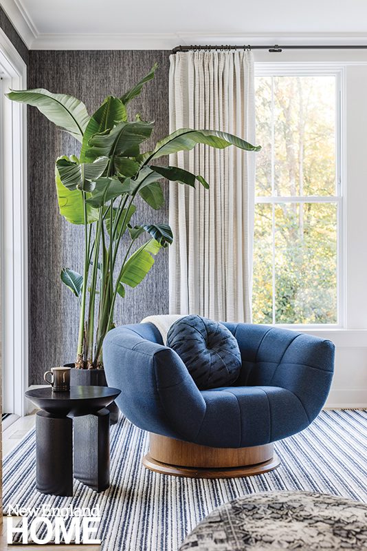 To bring personality to the predominantly white kitchen and create a stronger connection with the nearby family room, Hirsch used a black Phillip Jeffries lacquered weave wallpaper in both spaces. “Most people would be frightened when you show them black, but not this client,” Hirsch says. Plush, pale furnishings (in performance fabrics for easy care) are joined by a playful striped rug and accents of deep azure.