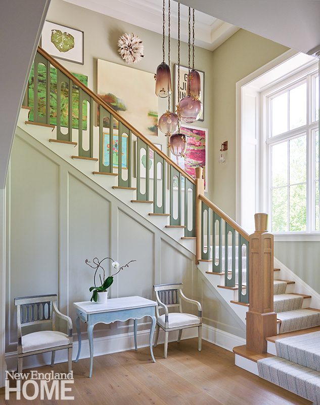 Drawing from the surrounding landscape, she built the interiors around tonal greens—lichen, sage, and celadon—warmed by terra-cotta and amethyst in textiles and lighting. Antiques from the couple’s former Southport home mingle with pieces gathered during travels, creating rooms that feel assembled over time. “We were blending two houses and a lifetime of collecting,” Whitcomb says. “It had to feel cohesive, not newly installed.”