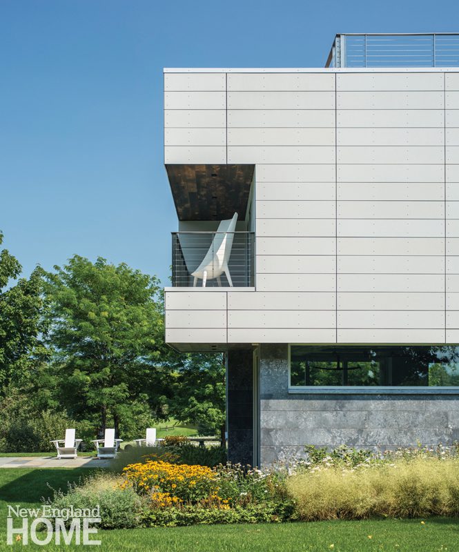 By the time their second son was accepted by the college, the couple had purchased eight pastoral acres with views of the Green Mountains and the Adirondacks in Cornwall. Over the years, they built a modest barn-like home. Landscape architect H. Keith Wagner set the stage for the structure, designing a series of terraces built of local Panton stone along with mowed paths leading to a picture-perfect pond.