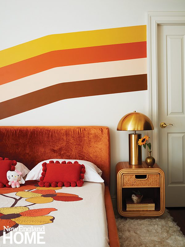 For a teen daughter with a fondness for 1970s mod, Ferraro went groovy with a hand-painted rainbow mural floating above a rust-colored velvet headboard, pom-pom-edged pillows, and a daisy bedspread. A teenage son is keen on camping and all things Adirondack. Ferraro coupled a striped wool Pendleton bedspread with a leather pillow, whimsical wall trophies, faux sheepskin stools, and windowpane carpet. With the room’s hunter-green walls and blackout Roman shades, he can blissfully burrow into his domain until noon. But then, the whole house is custom crafted to bridge disparate desires and hunker down in style.