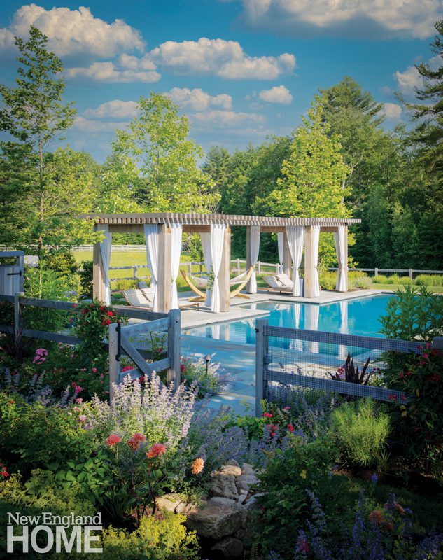 The close collaboration among the design team is especially apparent in the new swimming pool, an Eden-like setting featuring a shady pergola cleverly designed to appear to float on the water, and a lavish variety of blooming perennials and textural greenery.