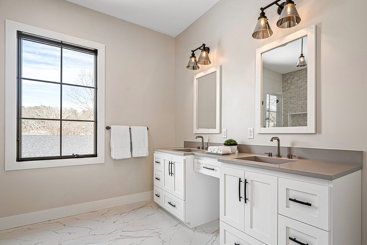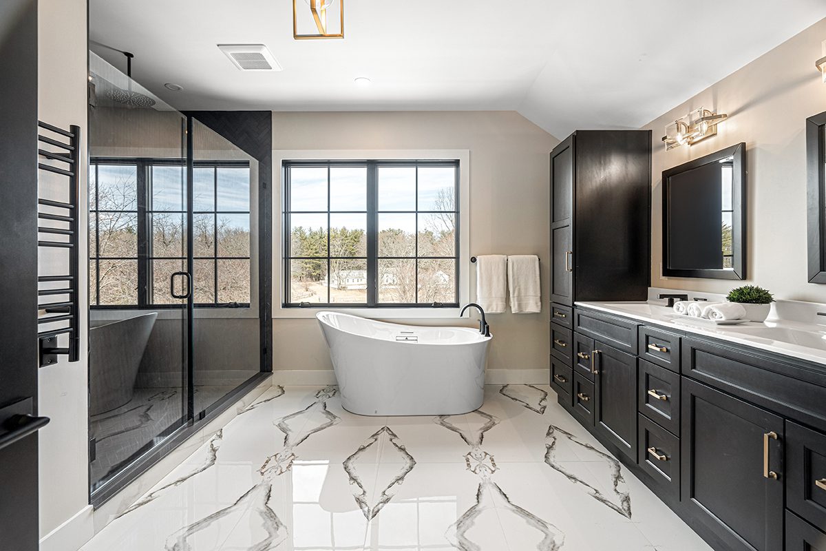 Another key to the contemporary floor plan is the luxurious primary suites on both the first and second floors. This layout allows for comfortable guest accommodations and the option for the homeowners to sleep on either the second or the first floor. Many parents like to sleep on the same floor as their young children, then move down to the main floor as the children grow. This savvy layout also adheres to the tenants of aging in place: a generous first-floor bedroom eliminates the need to leave this beautiful home in the future.