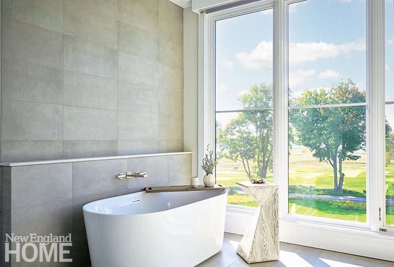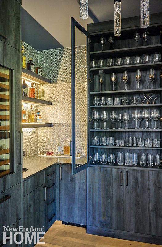 Rapp couldn’t resist indulging the wife’s love of the occasional glamourous touch. A powder room is outfitted in striking Platinum Wave marble from Norwalk’s Everest Marble and a deco-inspired chandelier of glass disks, while the commons room’s wet bar sports a sparkly metallic backsplash.