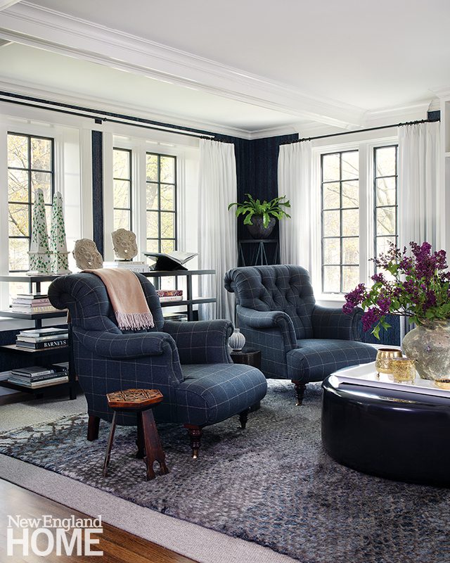 Craving more space for entertaining, Brady and her husband, Michael, hired architect Elise Braceras Stone to design an addition, which includes a garage, kitchen, primary bedroom suite, and a family room covered in navy blue grasscloth. “People get scared of dark colors,” acknowledges Brady, who kept the ceiling and trim white to offset the color and framed the windows in ombre fabrics that bridge the contrasting hues.