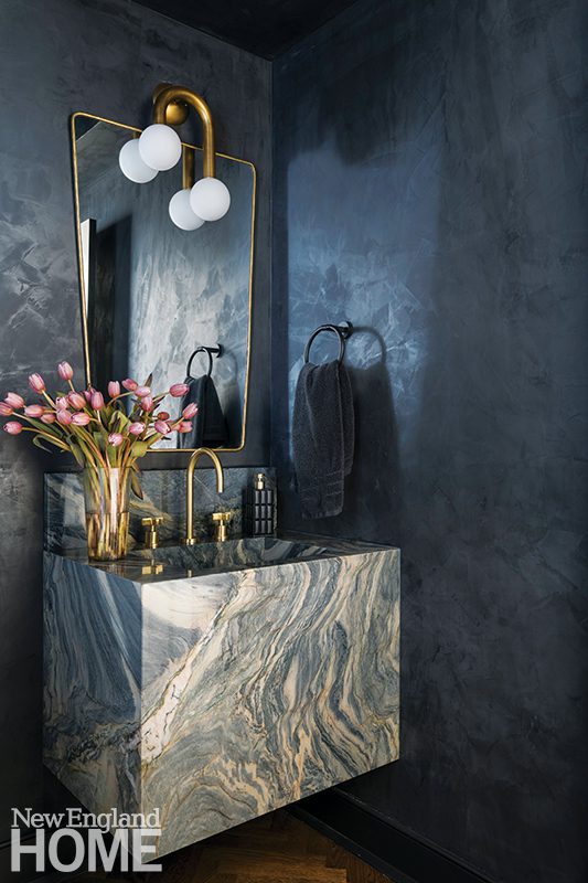 Cline delivered—in style. The cabinets are custom, and the countertops are crafted from a refined gray-and-white Italian marble. For sheer drama in a nearby powder room, Cline had the entire sink—front, sides, insert—constructed of a complementary marble.