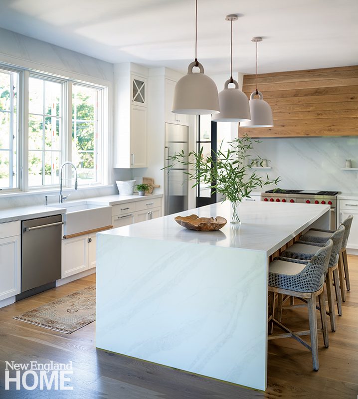 The land on which this Southport house sits, an expansive field at the top of a ridge, inspired designer Gaelle Dudley to create what she calls a “moody, industrial farmhouse.” In the kitchen, that translates to a sleek, modern space with an overlayer of earthy, textured elements. The wide-plank oak floor and a mix of natural oak and white-painted cabinetry speak to the farmhouse style, while the waterfall island and single-slab backsplash, both of Enigma white quartz, add the contemporary feel.