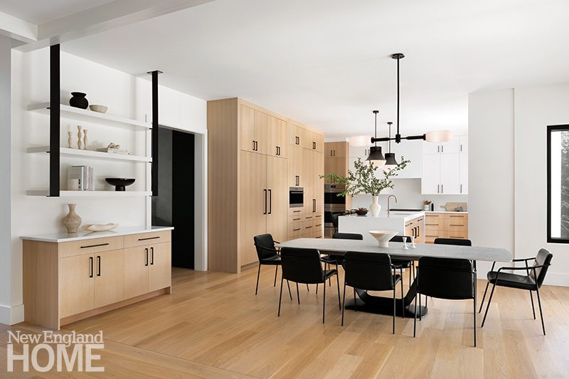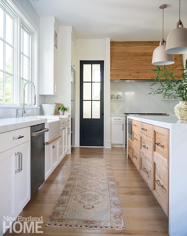 Danielle and Jonathan Shemesh had definite ideas of what they wanted for their Westport kitchen. “We wanted a more minimalist look, my wife likes to stay organized, and it was important to have enough storage for all the pots and pans,” Jonathan says. With three children under the age of five (plus a dog in the mix), it’s no wonder organization is a priority. Designer Merrin Jones fashioned a kitchen with a place for everything, including a tall bank of handsome white-oak cabinetry that hides the fridge and an appliance garage and has cupboards and drawers aplenty.