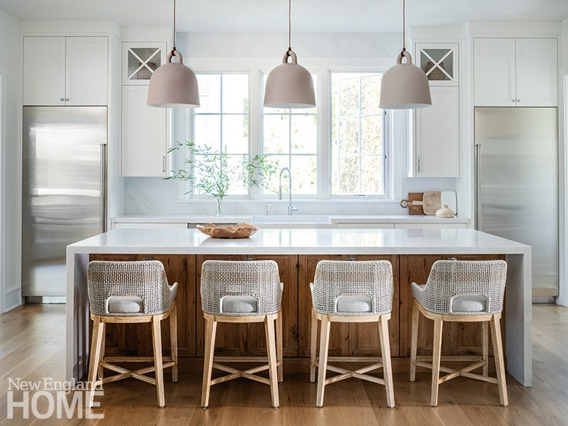 Dudley introduced an industrial touch in the oak shiplap range hood and stainless-steel appliances and brought textural interest to the subtle, earthy palette with pendant lights that look like cast clay and island stools of woven rope. Thoughtful design touches, like the X detail on the upper cabinets that echoes the base of the island stools, add personality.