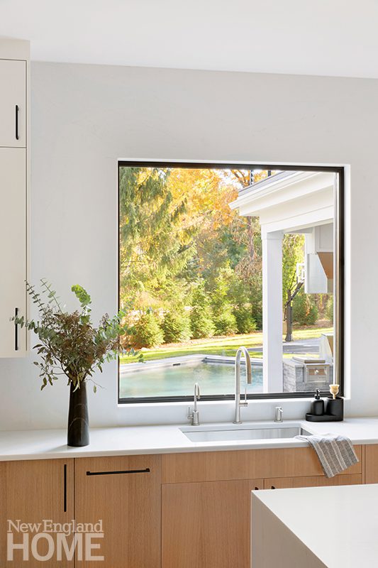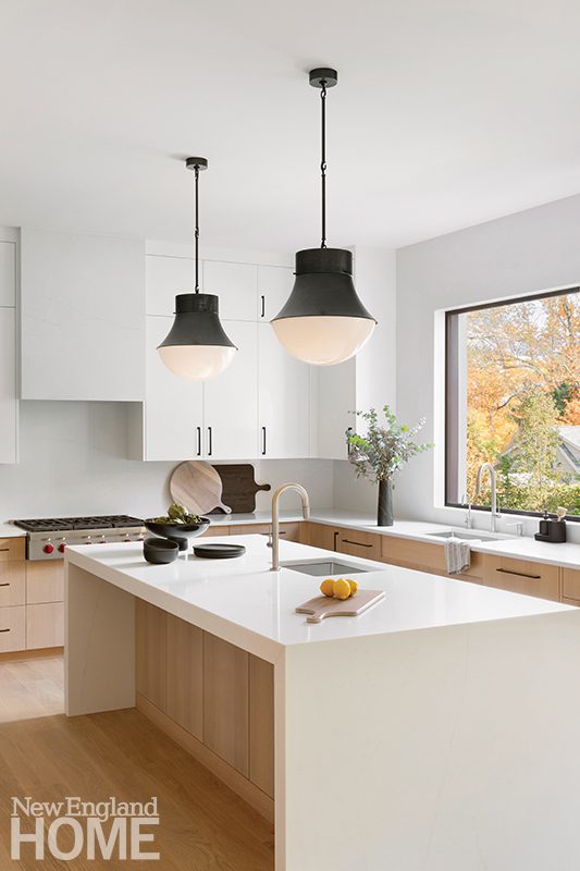 When it came to style, Jones says, “My clients are very cool, with a bit of an edge. They lean more modern.”White upper cabinets and white-quartz surfaces, including the sleek waterfall island, provided the minimalist look, and Jones warmed things up with white-oak lower cabinets and black accents.
