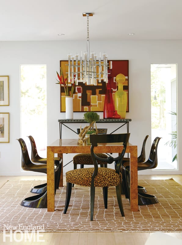 “I like using bold colors and patterns in smaller applications like pillows, accessories, and art,” he explains. “I have always been drawn to furs, skins, horn, and animal prints because of nature’s organic qualities. They add texture and warmth. It creates a great juxtaposition with the bold colors and modern and midcentury furniture.”