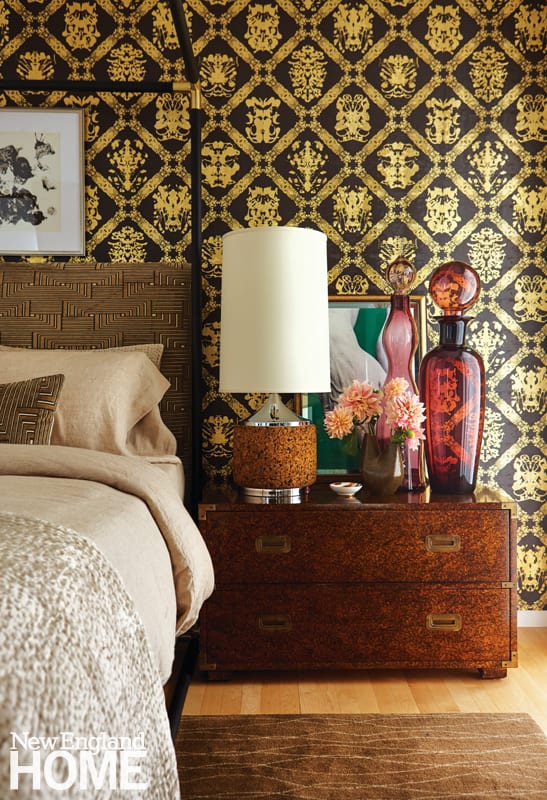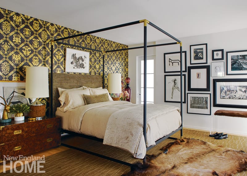 The designer also was not shy about asserting his vision in secondary rooms, like a powder room with walls, ceiling, and a door covered in gold and cream graphic paper. “I think small rooms should have big personalities,” he says. “They should be like jewelry boxes.”