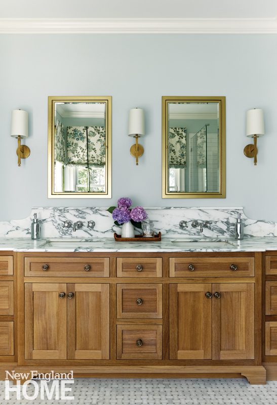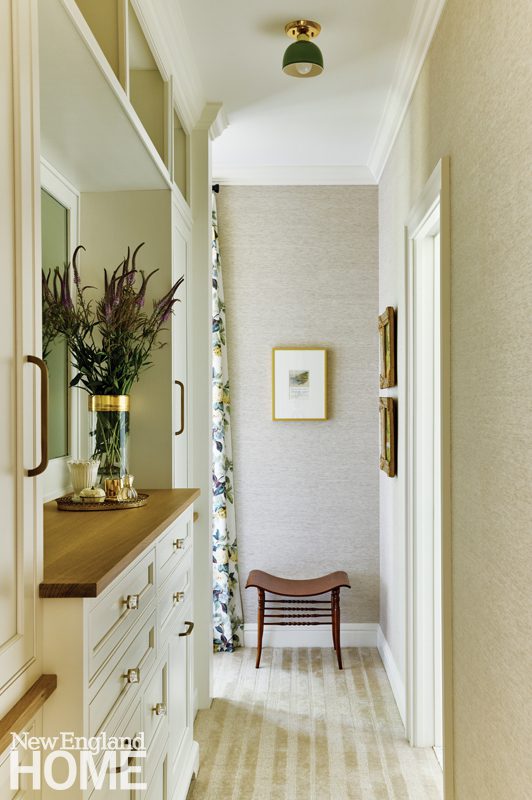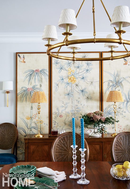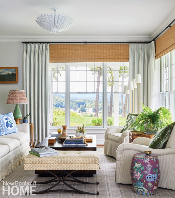 The chaise, from Century Furniture with fabric from Romo, was among new pieces the designer and her client added to a mix that included the family’s antique dining table and a pair of heirloom wing chairs that Layden had already revved up with a broad blue racing stripe. “She really wanted a place where everyone had somewhere to sit,” says McCory, who added two swivel chairs to the mix. “It was about getting as much comfortable seating as would feel intentional,” she says.