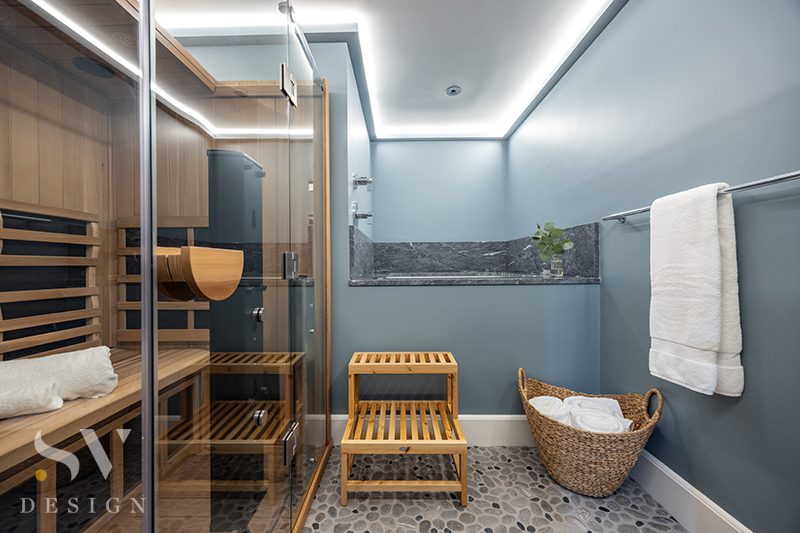 The lower level suits the homeowners’ love of entertaining. A more casual family room space is stacked directly under the living room, for a different perspective of ledge and water. A patio space underneath the porch offers seating, a firepit, and a spa. There’s a home theater and bar, gym, and two guest rooms. A spa-like bath houses an infrared sauna, elevated Japanese soaking tub, and textured pebble floors.
