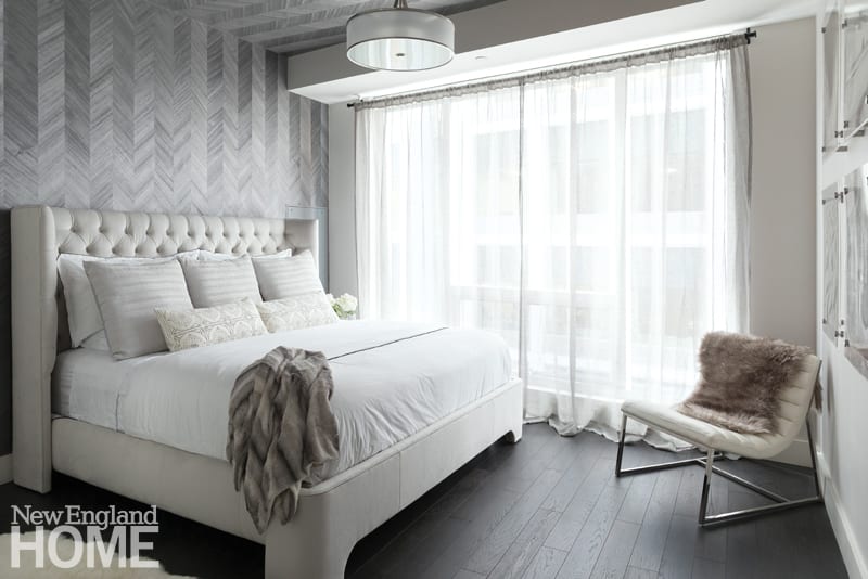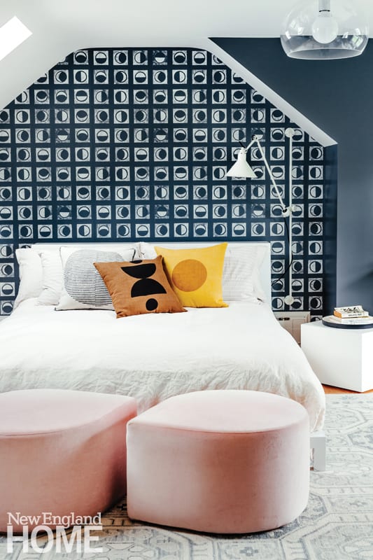 Turning tricky situations into major moments can be the best part of a design. To mitigate the effect of two disparate soffits in a Boston condo bedroom, Newbury, Massachusetts, designer Gina Baran ran wallcovering in a wood-like herringbone pattern from behind the bed onto the ceiling. “It creates visual impact, drawing the eye to the middle of the room and distracting from the soffits,” she explains. Maine designer Tyler Karu employed a similar stratagem in her own upstairs guest bedroom by mirroring the angle of an awkward roofline to form a decorative wallpapered niche that serves in lieu of a headboard.