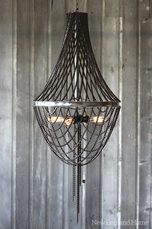 Recycled and repurposed materials are showing up increasingly in new lighting fixtures. Dietz is particularly drawn to the Borah chandelier manufactured by Chandi. Though it sports a rather classic shape, bicycle chains give it a distinctive steam-punk vibe—past, yet clearly modern.