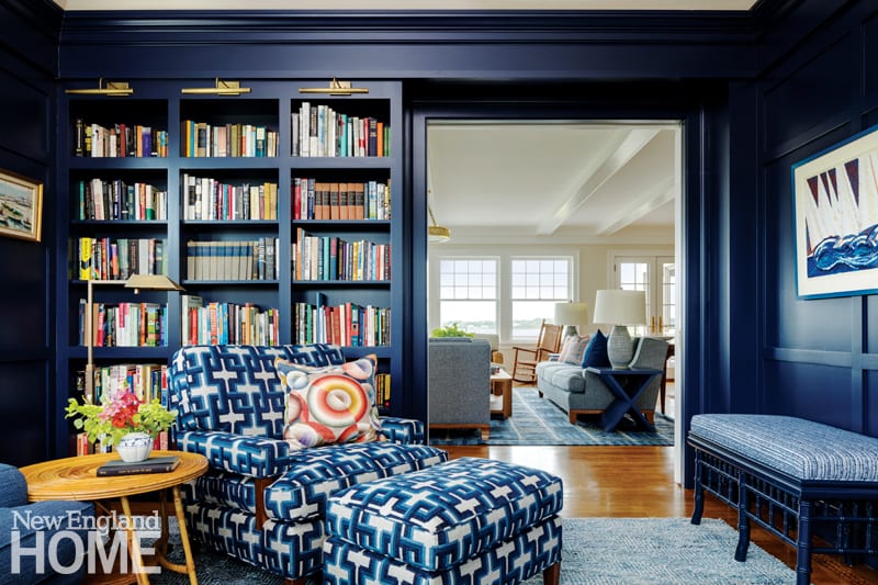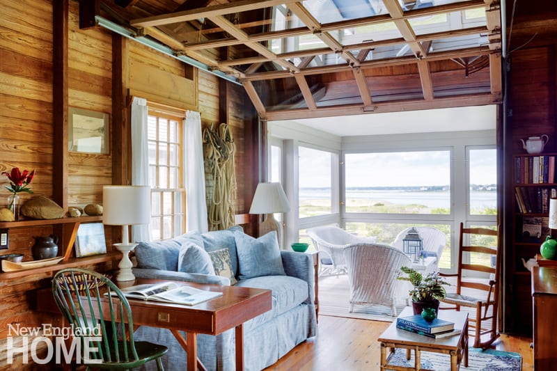 No part of the house fits that description better than the recycled cottage. Self-contained, with its own kitchen, living area, bedroom, and screened porch, it remains uninsulated, joined to one of the first-floor guest rooms via an exterior door that closes it off in winter. Knowing her clients’ affection for its rusticity, Wells changed only the upholstery on the existing furniture. Before emptying the cottage in order to move it (it was temporarily relocated so that the framing for the new house could be built), she and designer Marianthi Thomas painstakingly documented its interior.