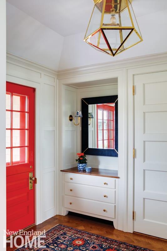 Interior designer Heather Wells amped up the family friendliness with the easygoing, lived-in comfort of vintage furniture and rugs, and lively colors like Fine Paints of Europe’s Poppy, which debuts at the front door and makes cameo appearances throughout the house. “They really wanted it to be user-friendly, colorful, cheerful, but very low-key,” she says.