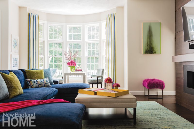 A home outside Boston goes from beige to bold with whimsical art, modern patterns, and feel-good design for the whole family.