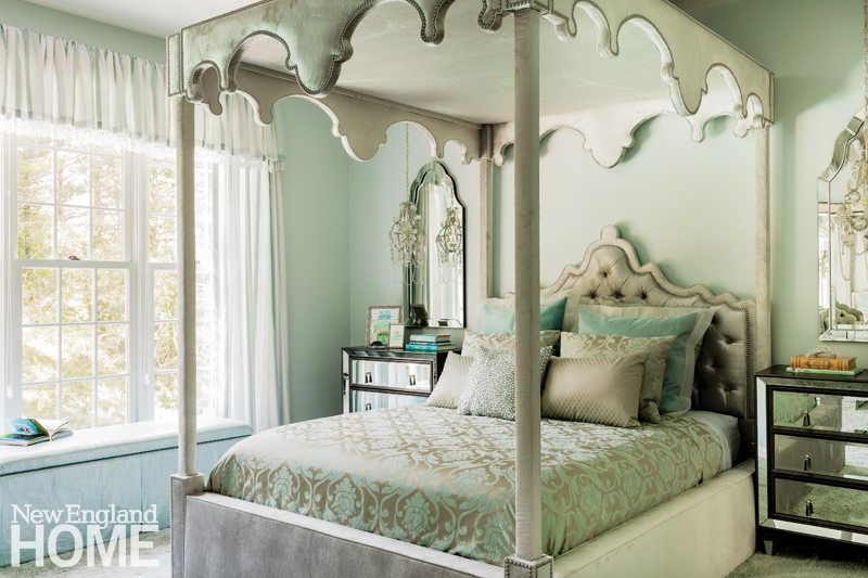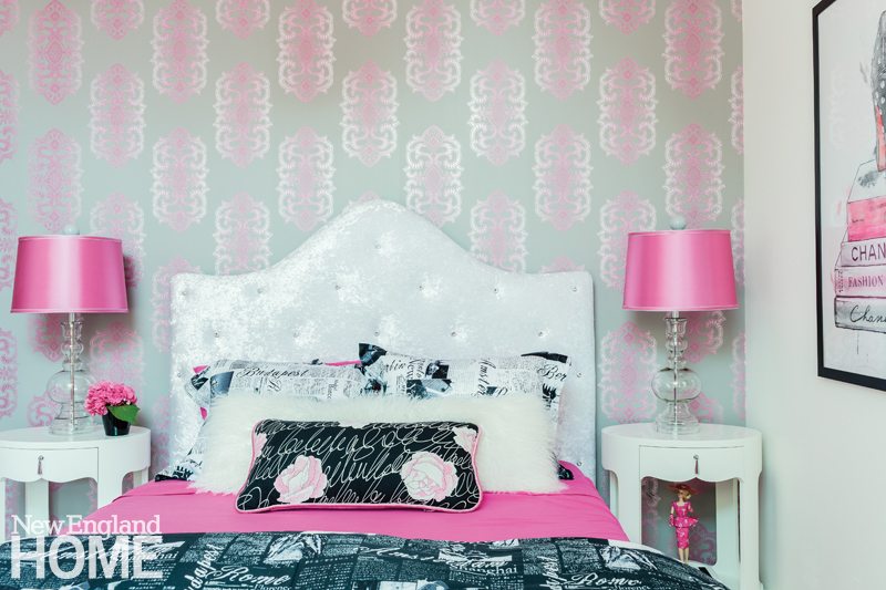 The couple wanted their kids to personalize their spaces as well, so Pellows sat down with each child to talk style. The family had recently traveled to Paris, and the eldest daughter was enamored of Versailles with its romantic rooms and Hall of Mirrors. So Pellows recreated the look, in the requested blue color scheme, with a fairytale canopy bed and glamorous mirrored accents. On the other end of the spectrum, the youngest daughter wanted a room fit for Rock Star Barbie. Pellows obliged with a hot-pink theme punctuated by well-placed black-and-white accents for some age-appropriate edge. The son’s high-ceilinged bedroom is sleepover-ready; in addition to a regular bed, there’s a loft bed accessed by ladder. A desk tucks into the wall space below the loft.