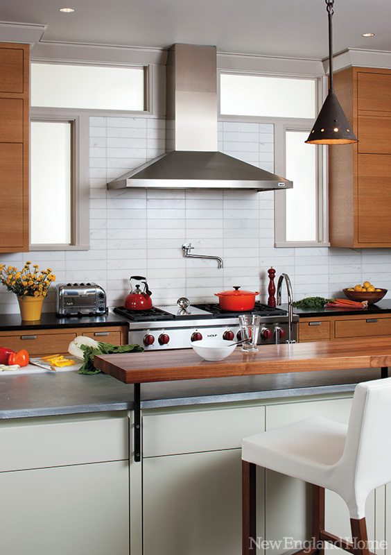 In the kitchen, where LDa, Rivoli and Venegas and Company collaborated, craftsmanship details are on full display in the island, which looks as if one end grew from a giant walnut trunk. Traditional Carrara marble tile is given a modern spin in the backsplash, installed in horizontal blocks around a grouping of windows that surround the range hood, bringing in light from the mudroom.