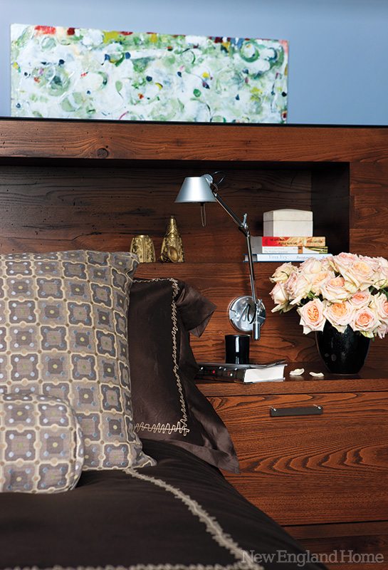 Velvety blue walls create a quiet atmosphere in the high-ceilinged room, where rich brown custom bedding echoes the soaring chocolate beams. Instead of protruding, shelving recedes into the walls and cabinet doors are flush.