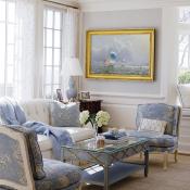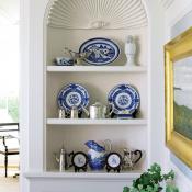 There are indoor views, too, as carefully crafted vignettes delight at every turn. And there’s texture in this home—lots of it: upholstered chairs, plush rugs, rich drapes, striéd wallcoverings, polished wood. The living room is tradition personified: white tufted sofa, slipper chairs, glass-topped coffee table, painted seascape in a gilded frame. It is expertly layered, as is every other room, even the far less formal kitchen/great room, library and lower-level family room. There’s a sophisticated, yet organic, quality to all of the fabrics and floor coverings, and the spaces—one more pleasing than the next—are almost all bathed in shades of blue. Who knew there were so many?