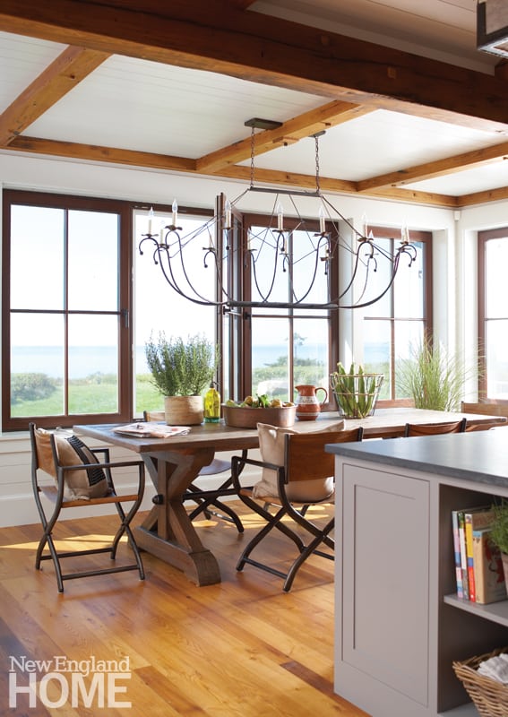 The home’s location also presented challenges. “When you’re building so close to the water,” says Palmerini, “there are rules about how high a house can be, so that you don’t block neighbors’ sightlines.” To honor those limits, the architects designed the house as one above-ground story of about 3,775 square feet, with another 2,200 square feet of finished living/entertaining area in the basement. The ground floor—a series of spaces connected by archways—is just one room deep, offering Vineyard Sound views everywhere.