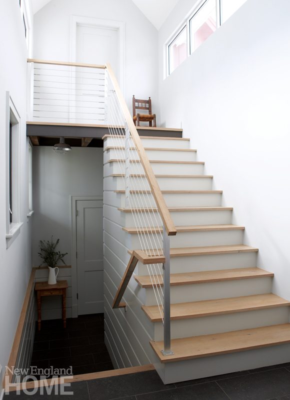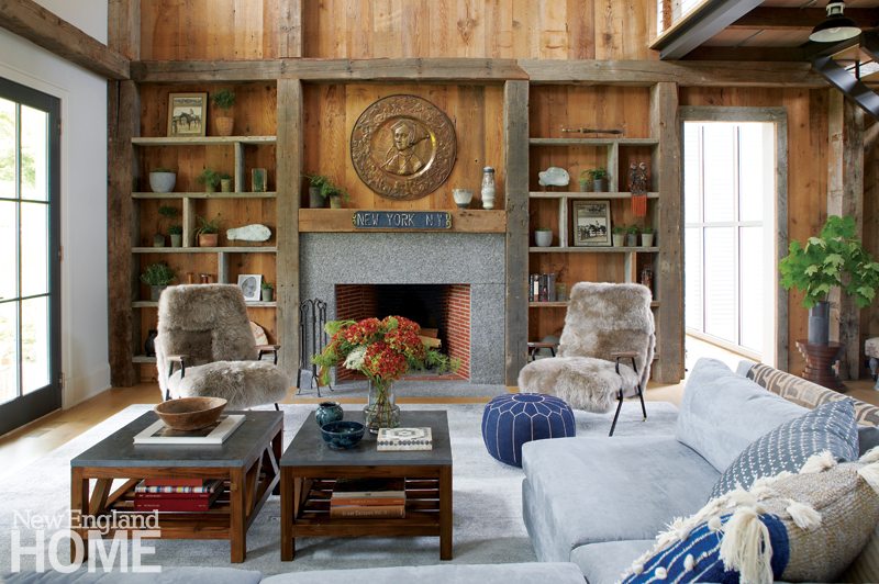 That harmony is particularly evident inside the home’s two-story great room, where, just inside the front door, an open staircase comprising a steel carriage, reclaimed-wood treads, and cable railings twists up to an open bridge that spans the room above the front door. Beyond the shelter of the bridge, the great room expands upward, with reclaimed barn beams, exposed conduits, and industrial-inspired lighting suggesting that this comfortable space may have originated as a working barn. On the back wall, clerestory windows and French doors open to a south-facing back porch, filtering light into the room.
