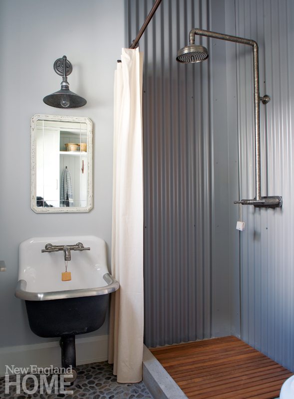 In a complementary move, she engaged materials as design elements in several areas, including the first-floor bathroom, where she employed the home’s exterior corrugated siding to line a shower stall. Other than installing it vertically rather that horizontally, “there was no need to change it,” Hirsch says. “That’s the beauty of having such a harmonious interior and exterior.”