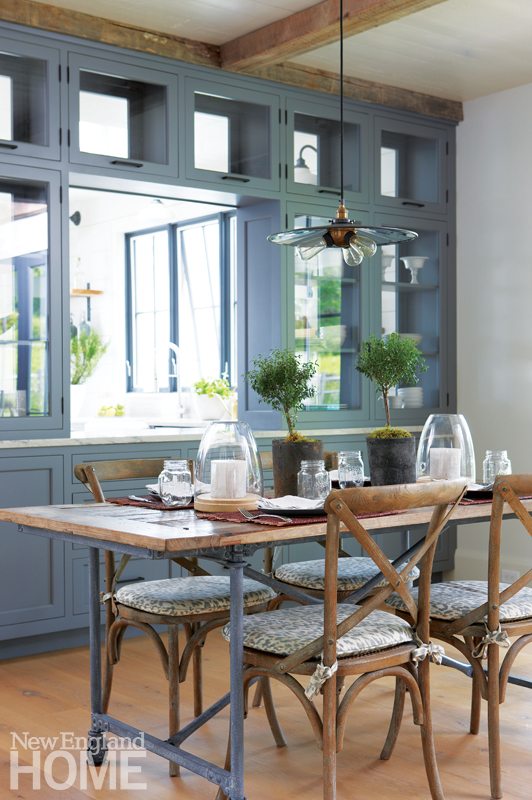 Rustic beams introduced in the great room extend toward the kitchen, creating a low ceiling that defines the dining area. A wall of cabinets with a pass-through in the center—one of Robert’s must-haves—both separates and links the two spaces.