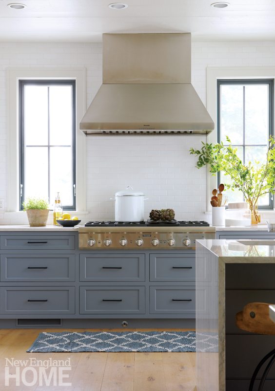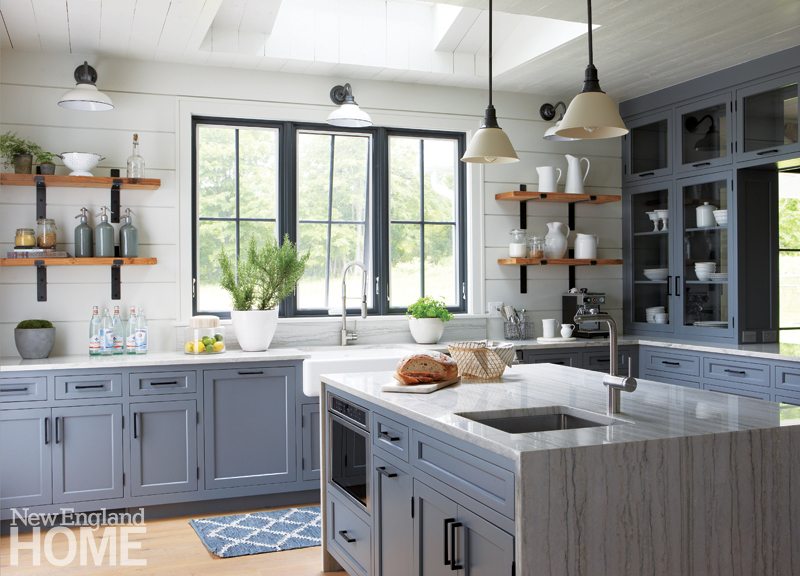 From a variety of materials under consideration for the kitchen, Hirsch selected a painted ceiling of character-grade oak, ten-inch poplar shiplap on the walls, and white Macaubas quartzite countertops. The gray-blue Shaker-style cabinets have inset doors and simple black pulls that coordinate with the aluminum windows and the metal straps on open shelves that flank the farmhouse sink. While confining the kitchen palette to these mostly traditional materials, Hirsch offset its rusticity with a modern twist—a waterfall countertop on the island made of the same quartzite used on the perimeter.