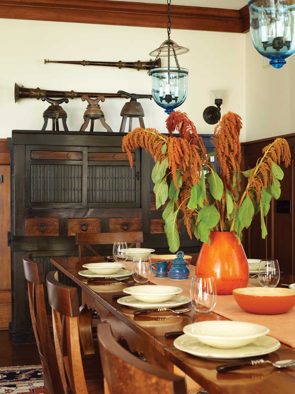 Rugs from Yayla Tribal Rugs in Cambridge, Massachusetts, form the basis for the palette in the living and dining areas, where blues, burgundies, beiges and creams predominate, punched up here and there with bits of burnt orange. “It’s a year-round palette,” the designer notes, “because the family uses the house more than in just the summer.”