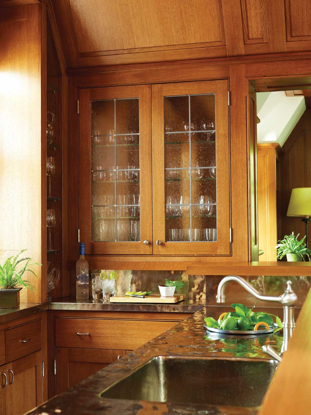 With children and frequent guests, plenty of space for play was in order. Catalano designed an addition with a three-car garage on the first floor and a spacious family/game/media room above. The addition, tucked in behind an existing solarium, is such a perfect match for the shingled, gable-roofed house that it looks like part of the original structure. Inside, cherry-paneled walls and furnishings in jewel tones (including a red-felt-topped game table) bring both energy and intimacy to the large space. A sitting area is anchored by a fireplace with a red-brick firebox and a surround and mantel of local fieldstone. A large flat-screen TV cleverly hides in the ceiling, ready to drop down for viewing. One corner of the room holds a handsome bar area outfitted in cherry cabinetry and a nickel-plated countertop and backsplash.