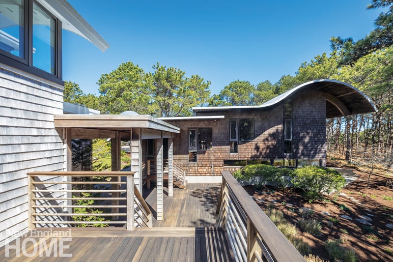 When Joy Cuming, founder and owner of Aline Architecture in Orleans, first laid eyes on what she calls The Wave House in Wellfleet, she knew she wanted to respect the vision of the home’s original architect, David Savage, while modernizing and expanding the space. Savage, a Frank Lloyd Wright devotee, designed and built the house in the 1970s as his primary residence. He eventually sold the property to a ceramicist and a novelist who, after living in the space for several years, decided they needed more room. The couple reached out to Cuming, who reimagined the home as a grouping of buildings with similar wave-like roof forms.