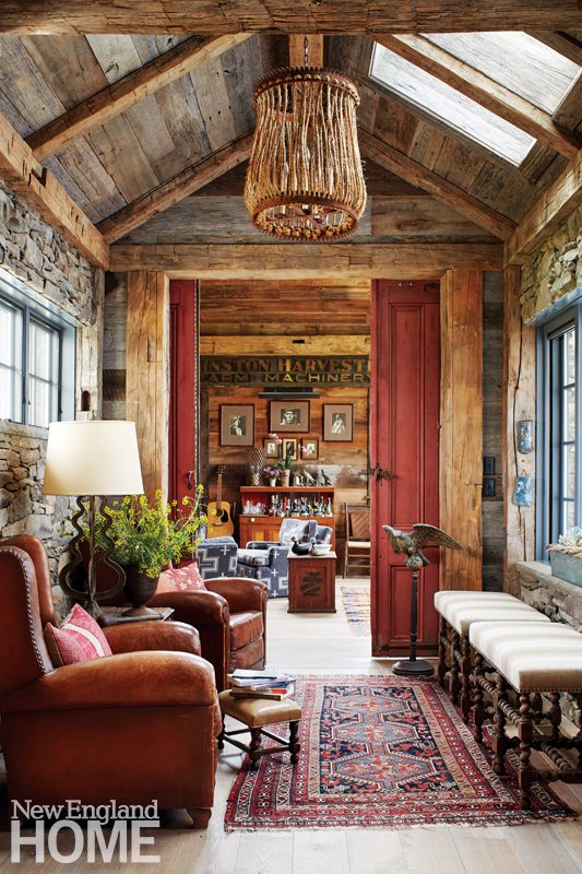 A corridor with large windows and skylights (what she describes as an enclosed breezeway) connects the great room to a large den that she calls the barn room. It can be closed off from the rest of the house by sliding barn doors with their original hardware that she bought for $100 at an antique store in Pound Ridge. The doors set the tone for the room, which is furnished in a hybrid Adirondack/Rocky Mountain style.