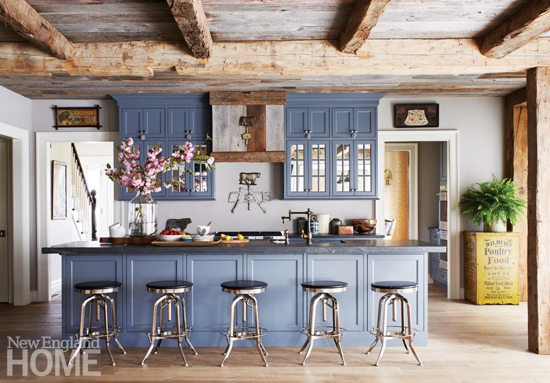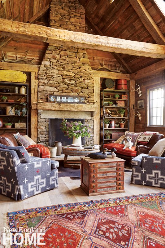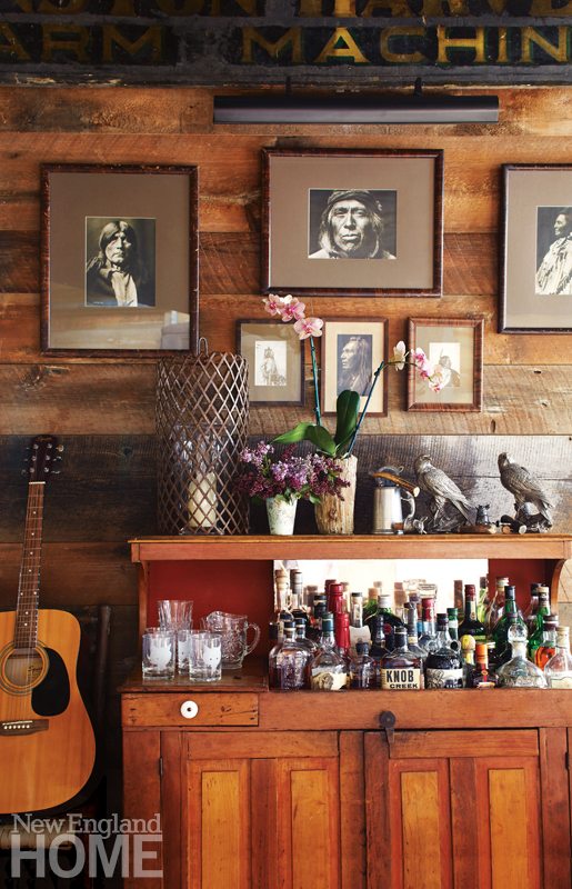With a big stone fireplace that incorporates granite from the original house’s foundation, the barn room has a “rustic outdoorsy feeling,” she says. There are big leather sofas with orange fabric cushions and vintage armchairs upholstered in Pendleton fabric. Perkins turned a massive antique butcher’s chopping block into a coffee table by cutting down the legs. What gives the room its soul are the collections of Native American art and artifacts that belonged to her mother-in-law and that sit on Restoration Hardware wood-and-metal shelves that look custom made for the space.