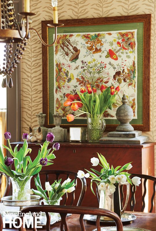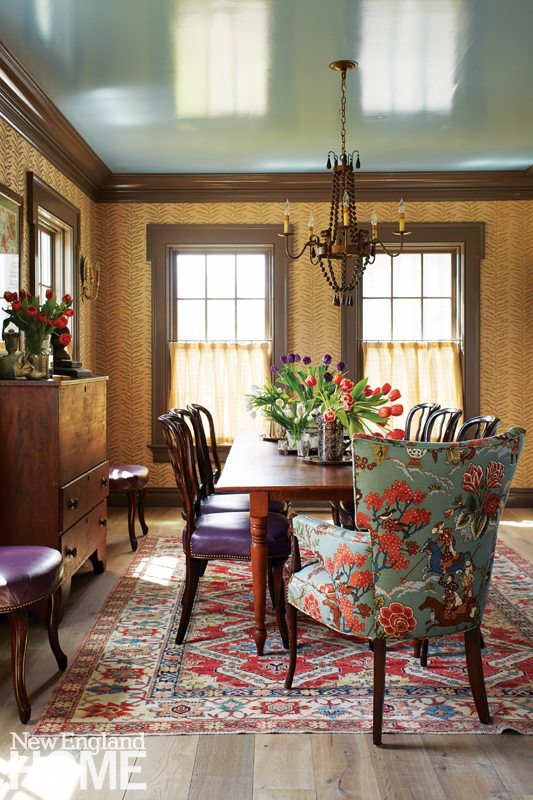 Although the house is determinedly casual, with no formal living room, Perkins wanted a formal dining room by the front door. The room reflects her background in traditional decorating with a twist. “I worked at a large design firm in Greenwich for six years before going out on my own, and my mentor taught me about being eclectic and using pattern on pattern,” she explains. The well-bred room has a handsome table of tiger maple with turned legs made by her brother-in-law. She has surrounded it with wooden chairs with purple leather seats and end chairs upholstered in a scenic Cowtan & Tout fabric. The floor plan allows her to bring in a connecting second table for large groups at Thanksgiving and Christmas, transforming the foyer into an extension of the dining room.