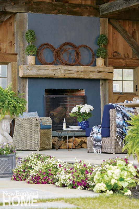 As she guides a visitor across the lawn and down to the swimming pool, she notes that the steps are made from stones that were part of the original house’s foundation. The pool house, a custom barn from Connecticut Post & Beam, has a tin roof, fireplace, bathroom, and a kitchen separated from the seating area by a pass-through such as you’d find at a beach club snack bar. There is also an outdoor kitchen with a massive grill and a pizza oven.