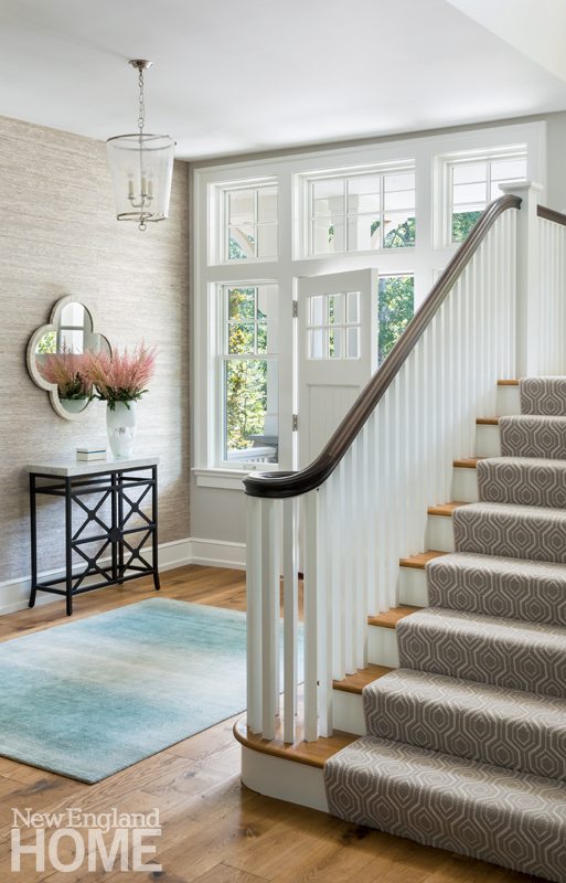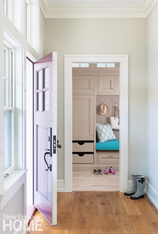 A pronounced front entry—another of the owners’ must-haves—leaves no doubt as to where guests are expected to arrive. There’s an airy foyer clad in a stunning grass wallcovering by Nobilis waiting just inside the door. But for everyday entering and exiting, there’s also a side entry alongside the garage, tucked discreetly behind a protruding bay window. Nearby, a highly organized mudroom offers storage for boots and lunch boxes. The kids can stuff their backpacks into cubbies, scuff off their snowy boots onto the tiled floor, and head right into the sunny kitchen for snacks.