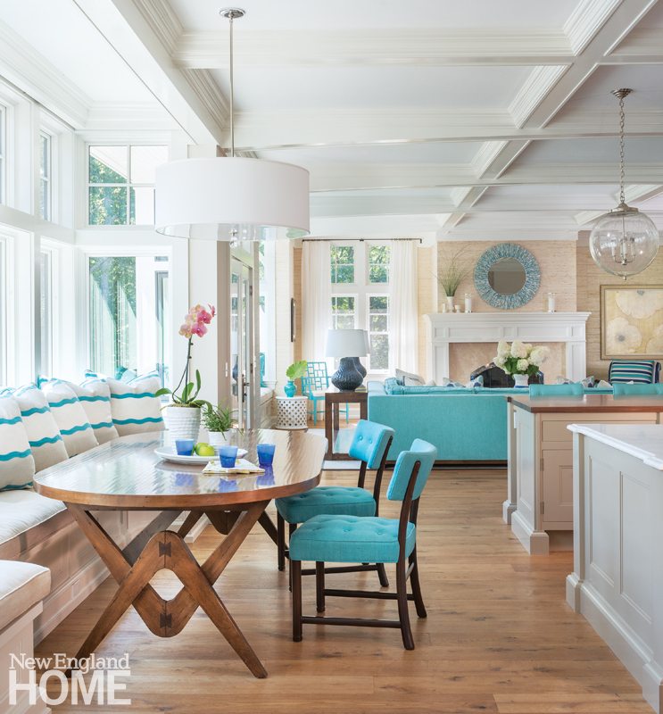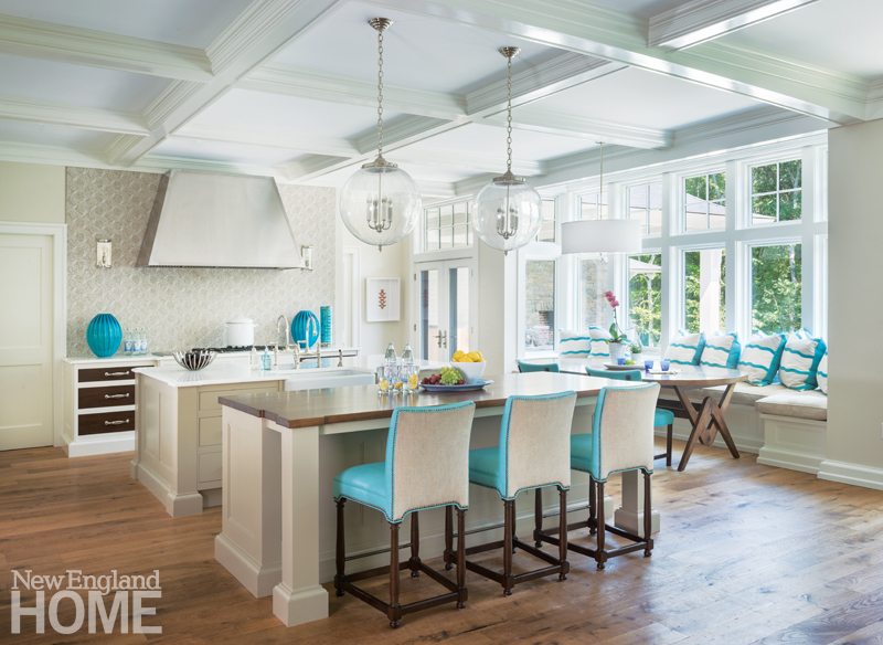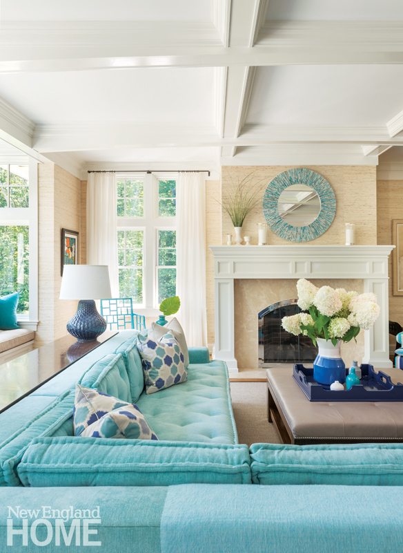 With three small children, Dan and Amber Koppen are busy, all right. But then, their energy level has always been high. Dan, a sports broadcaster and real estate agent, played in the NFL for eleven years, nine of them with the New England Patriots. His impressive record includes five Super Bowls, two of which were wins. Amber was a cheerleader for the Patriots. When the couple decided to build a new home in East Greenwich, Rhode Island, they chose a bright, open plan with—at Newport-based interior designer Eileen Marcuvitz’s suggestion—a turquoise theme to satisfy their desire for a relaxed, beachy ambience. “Turquoise is ocean-like but not cliché,” Marcuvitz explains.