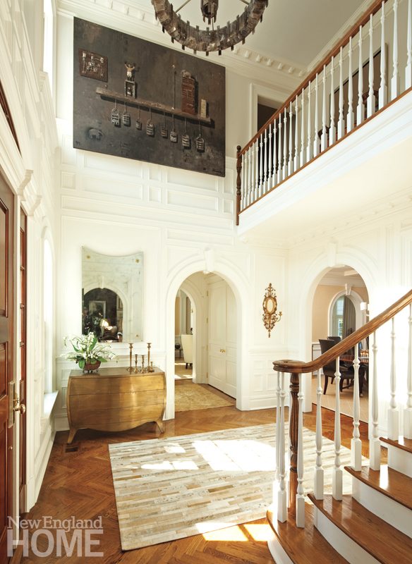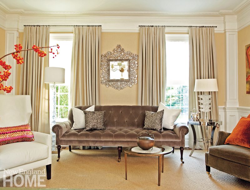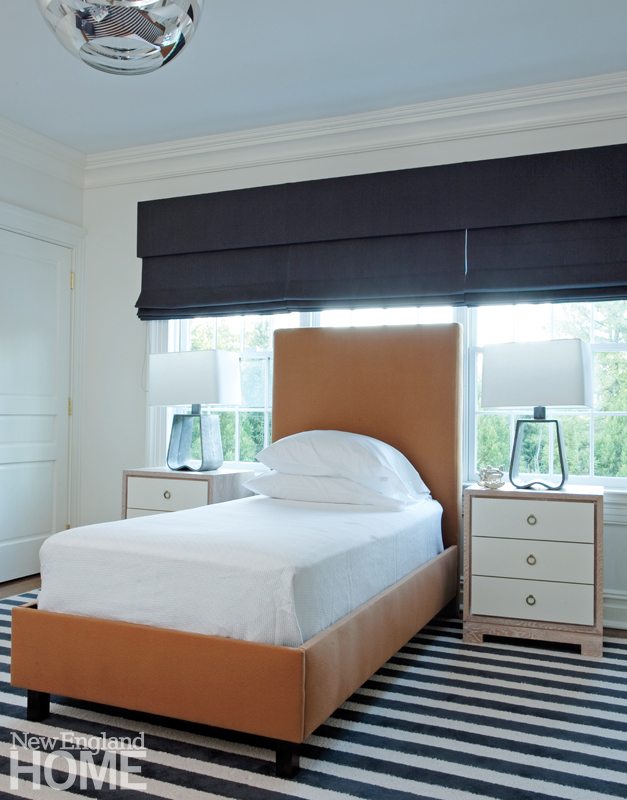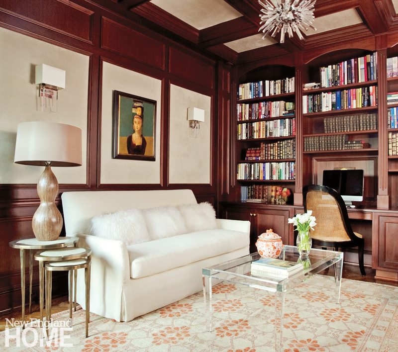 The nearby paneled library was comfortably New England–like, Scalo felt. But to better fit the owners’ preferred palette of primarily warm tones mixed with some cool, and to lighten the mood, the designer mounted a handful of pale suede panels to break up the dark walls. “It had to be just the right number,” she recounts. “Too many and it would have looked like a checkerboard.” In the evenings, hip acrylic sconces cast extra beams for bookworms.
