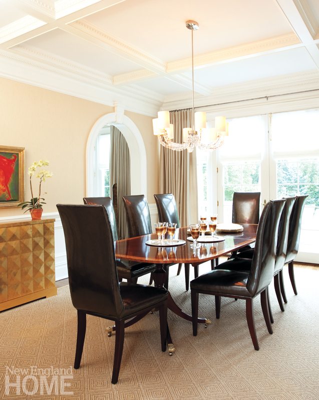 A straightforward sisal-weave rug pulls the large-scale living room together, and since the space opens to the dining room, Scalo wisely used the same floor covering there. The designer paired the traditional double-pedestal dining table with curvaceous leather chairs. A geometric console doubles as a buffet table for parties. The glamorous Murano glass chandelier that hangs above the table has an oval shape, Scalo points out, chosen to keep things a bit less predictable.