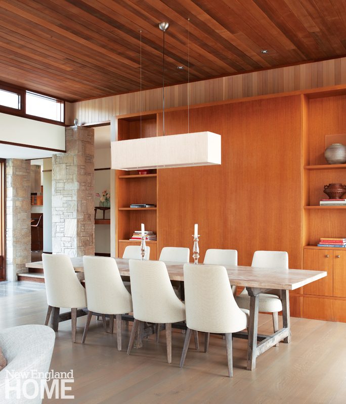 “There are thirty-three feet of glass on the north side of the living-dining room,” says Cedeno. “Yet it feels warm and cozy, in part because of the wood lining the ceiling.”