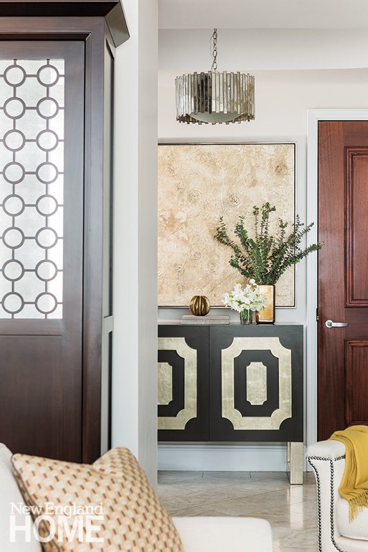 Also custom-made is the dark wood cabinet fabricated by South Boston’s Art Application to store the couple’s wedding china, serving pieces, and vases. “The front is made of interlocking wood circles against an antique silver background,” says Lovejoy Russell. Other furniture pieces were discovered by happenstance and seemed ideal for the space, like the Hollywood Regency–style cabinet in the foyer fitted with silver-paneled doors that repeat a pattern strikingly similar to the one on the living room carpet.